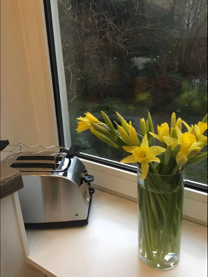 Die schicke Küche ist mit Herd und Spüle, Waschmaschine, Trockner, Geschirrspüle, Mikrowelle und Kühlgefrierkombination namhafter Hersteller sowie mit Geschirr und Küchenutensilien voll ausgestattet. Eine Design-Arbeitsplatte aus Holz mit einem kleinen Sitzbereich rundet die Einrichtung ab und ein wunderschönes historisches Kachelbild sorgt für Gemütlichkeit.