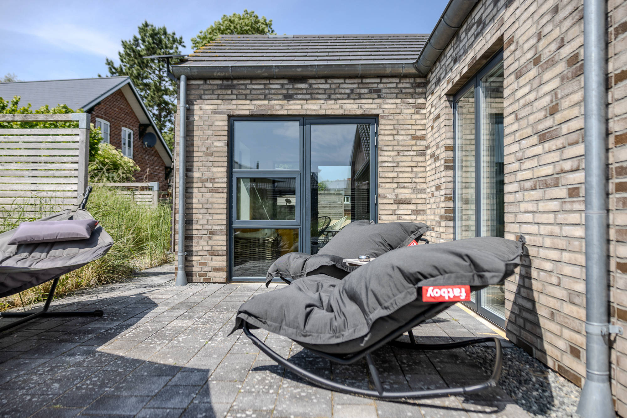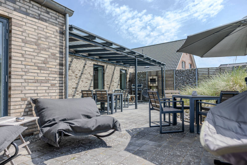 Apropos Draußen – die Terrassen sind beide perfekt ausgestattet. Eine für Sonnen-Anbeter mit Strandkorb und Beach-Club-Sitzecke. Die andere mit Lounge-Möbeln, einer Grill-Ecke und einem Glasdach, unter dem man auch genial sitzen kann, wenn der Wetter-Gott mal weniger gut gelaunt ist – ODER wir eine von diesen tropischen Nächten im Sommer haben (sollen ja mehr werden…).