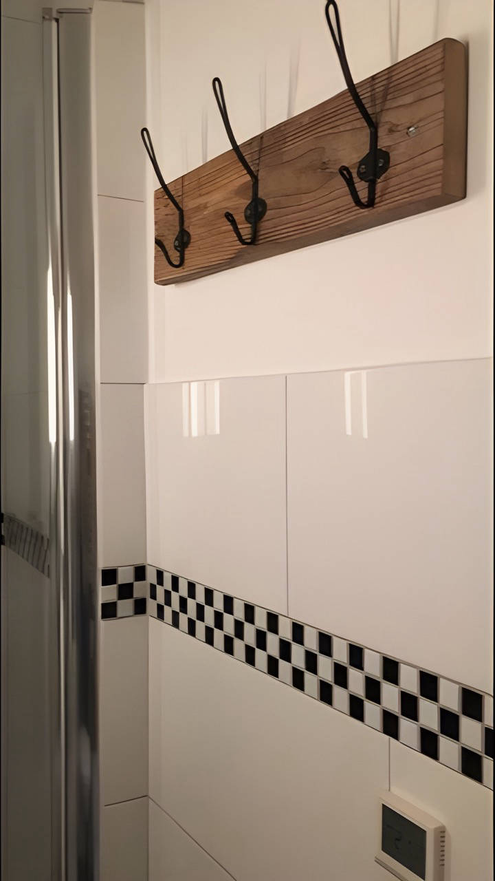 Das schwarz-weiß geflieste Duschbad verfügt über eine natürliche Belichtung und eine Belüftung sowie einen Handtuch-Heizkörper. Ein Teil des alten Mauerwerks ist kunstvoll freigelassen und gibt dem Raum ein besonderes Flair.