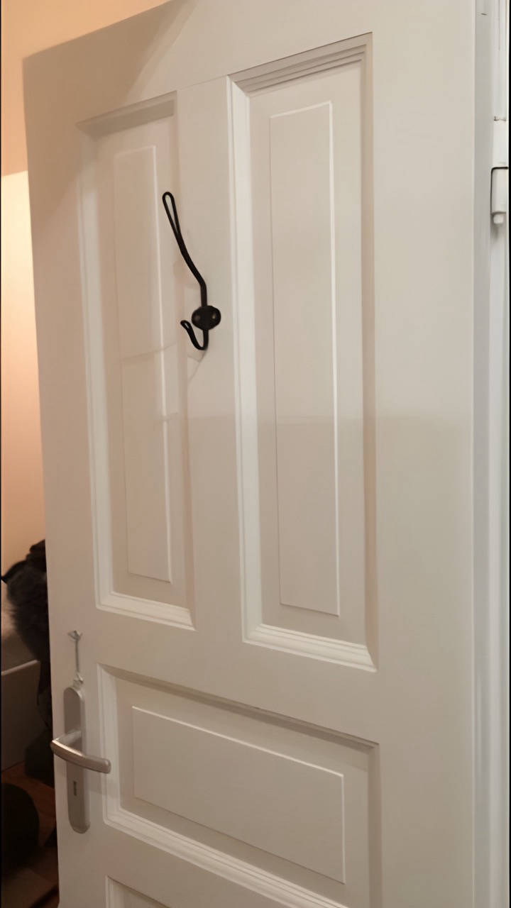 Die Wohnung verfügt über einen Dielenfußboden, hohe Decken und hohe Türen mit schönem Gefache. Die gesamte Wohnung ist weiß gestrichen und im Flur ist ein Stück alte Wand mit Farbputz schick gestaltet hervorgehoben.