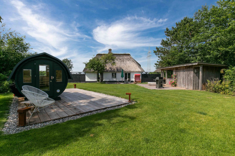 Das Haus hat mehrere nicht überdachte Außen-Terrassen (wenn die Sonne scheint…) und zusätzlich eine mit Dach (falls der Regen mal von der Seite kommt...). Gartentisch, Strandkorb, Liegen, Grill usw. – Jupp ist alles da – läuft…