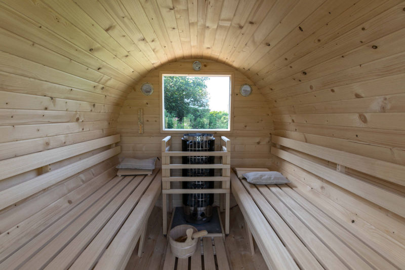 Die Fass-Sauna steht mitten im Garten mit Blick auf die Wiesen und den Tatinger Kirchturm.