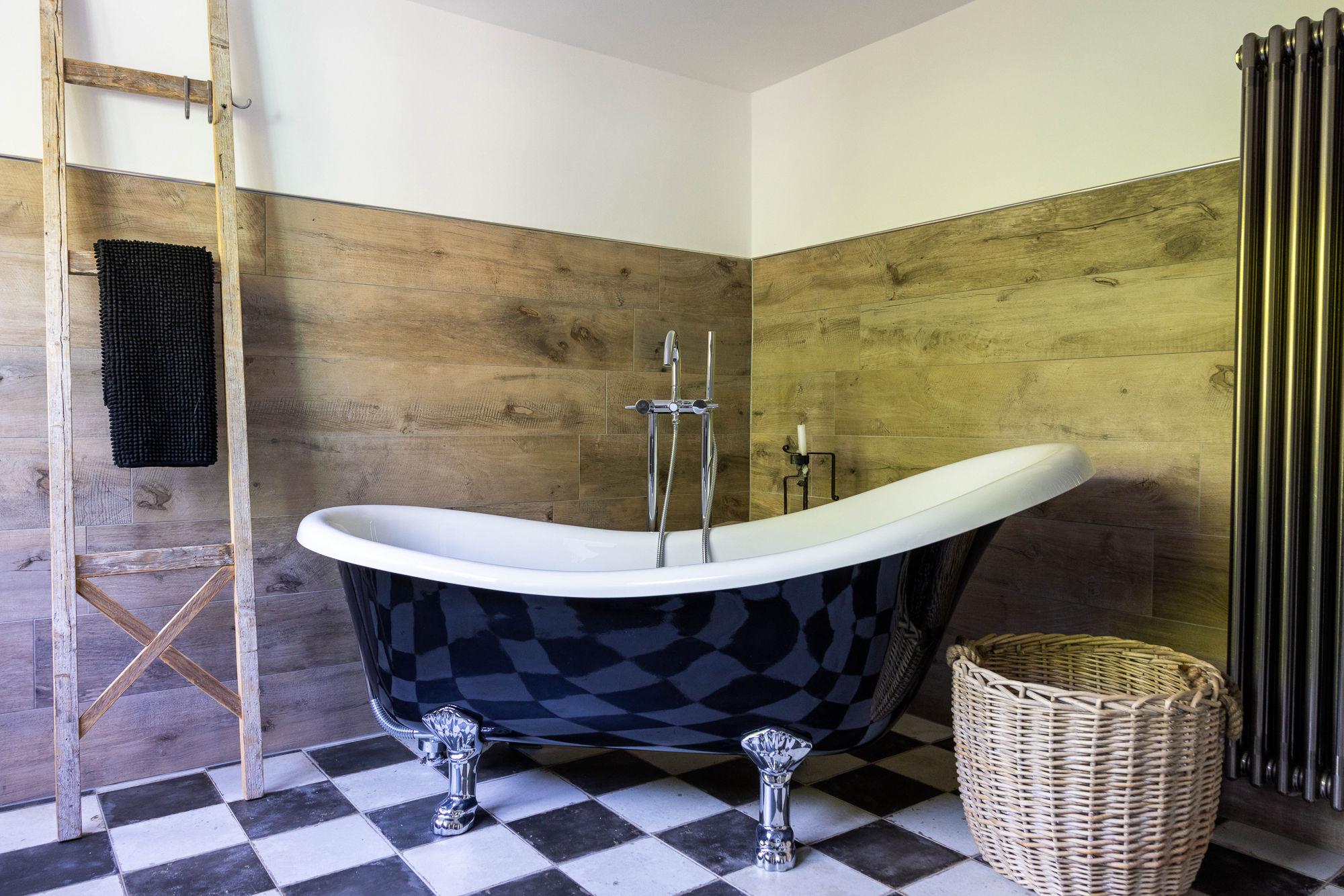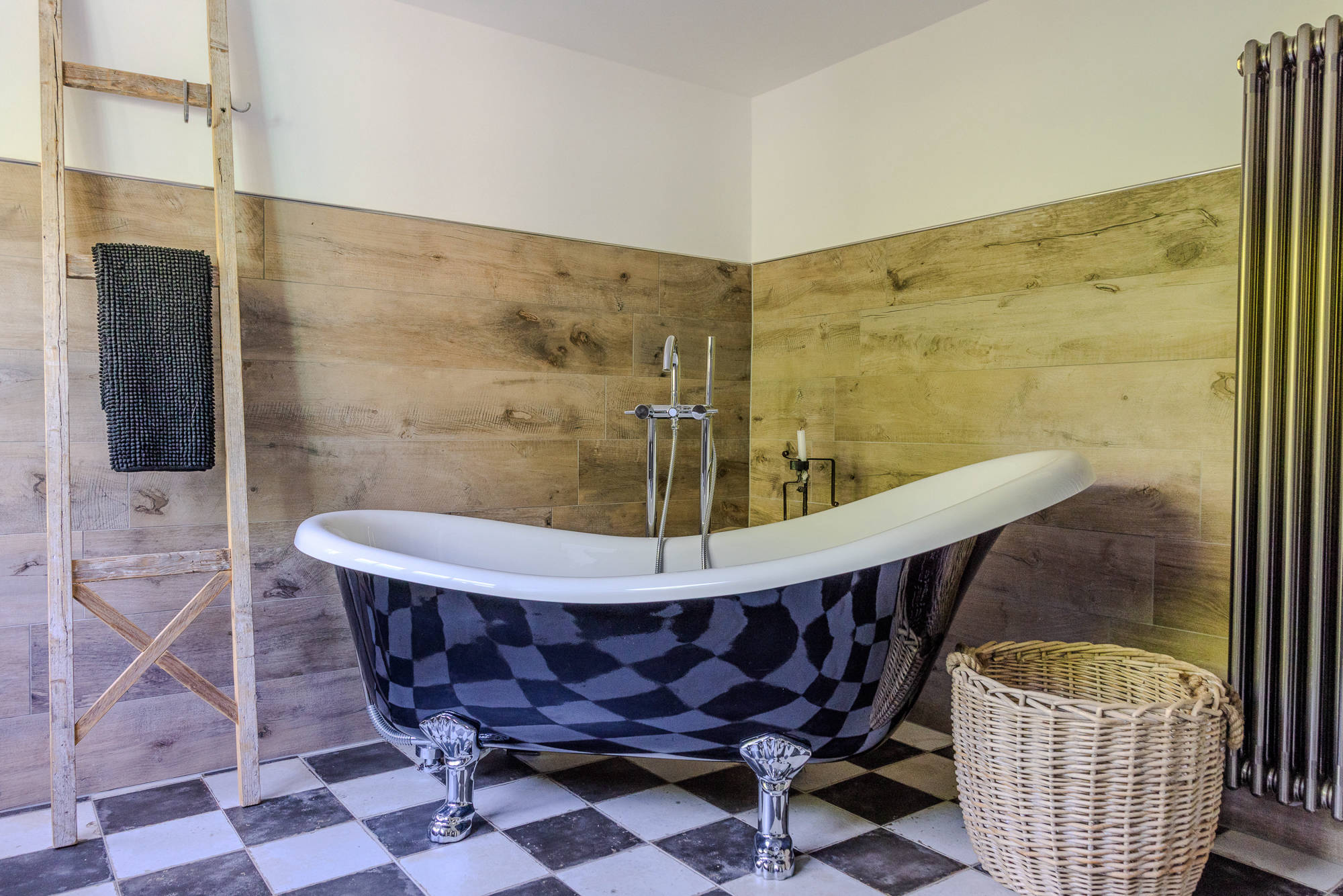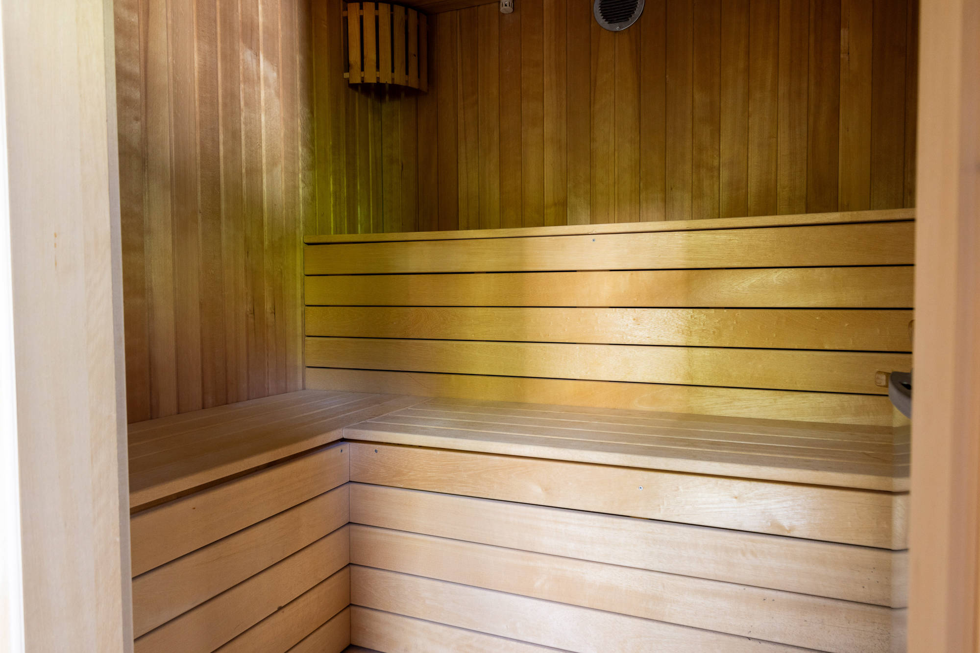 Die großzügige Sauna- und Badbereich im EG mit Badewanne und Walk-In-Dusche, Bademäntel, Saunahandtücher sind vor Ort.