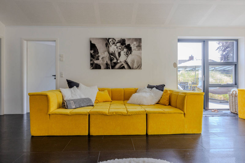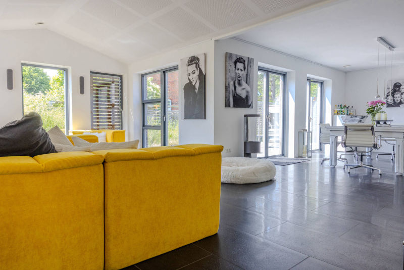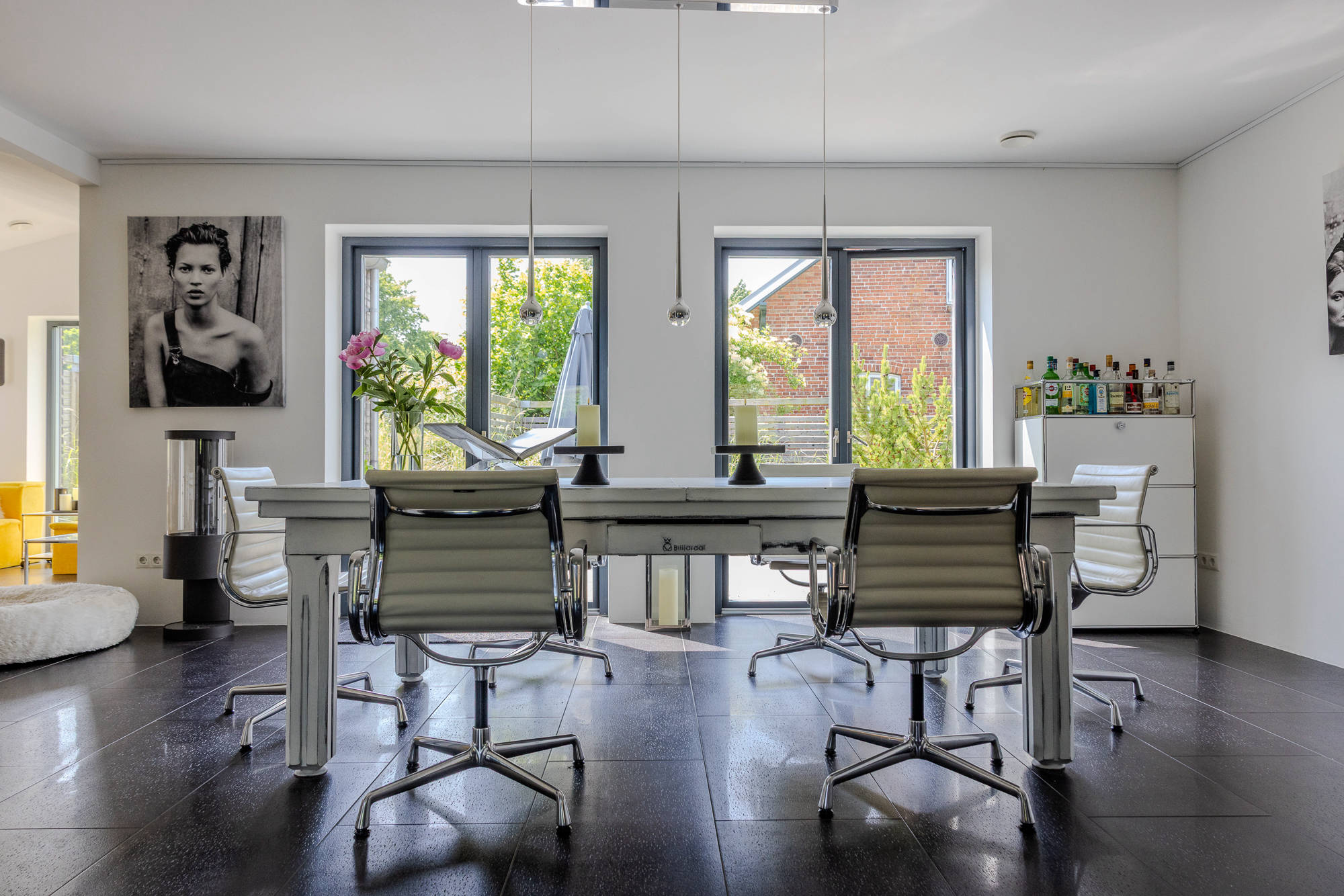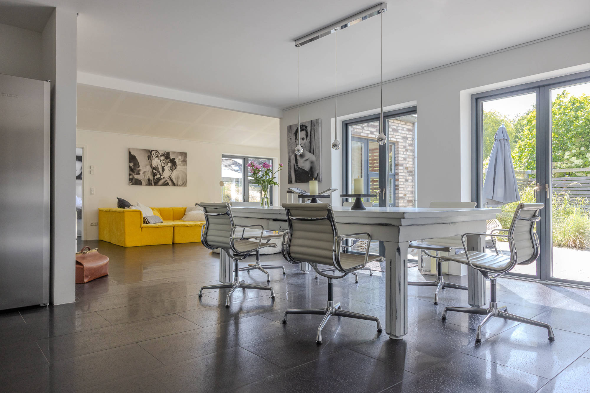Viele, ganz viele bodentiefe Fenster lassen Licht in den großzügigen Wohn-Essbereich hinein, geben die Blickachsen auf die Terrassen frei und verbinden Drinnen und Draußen in dem Haus zu einem wunderbaren Arrangement.