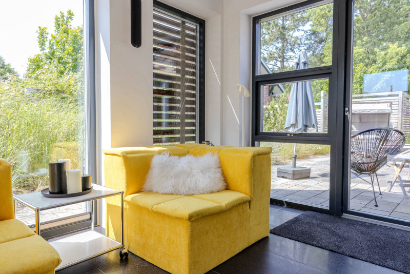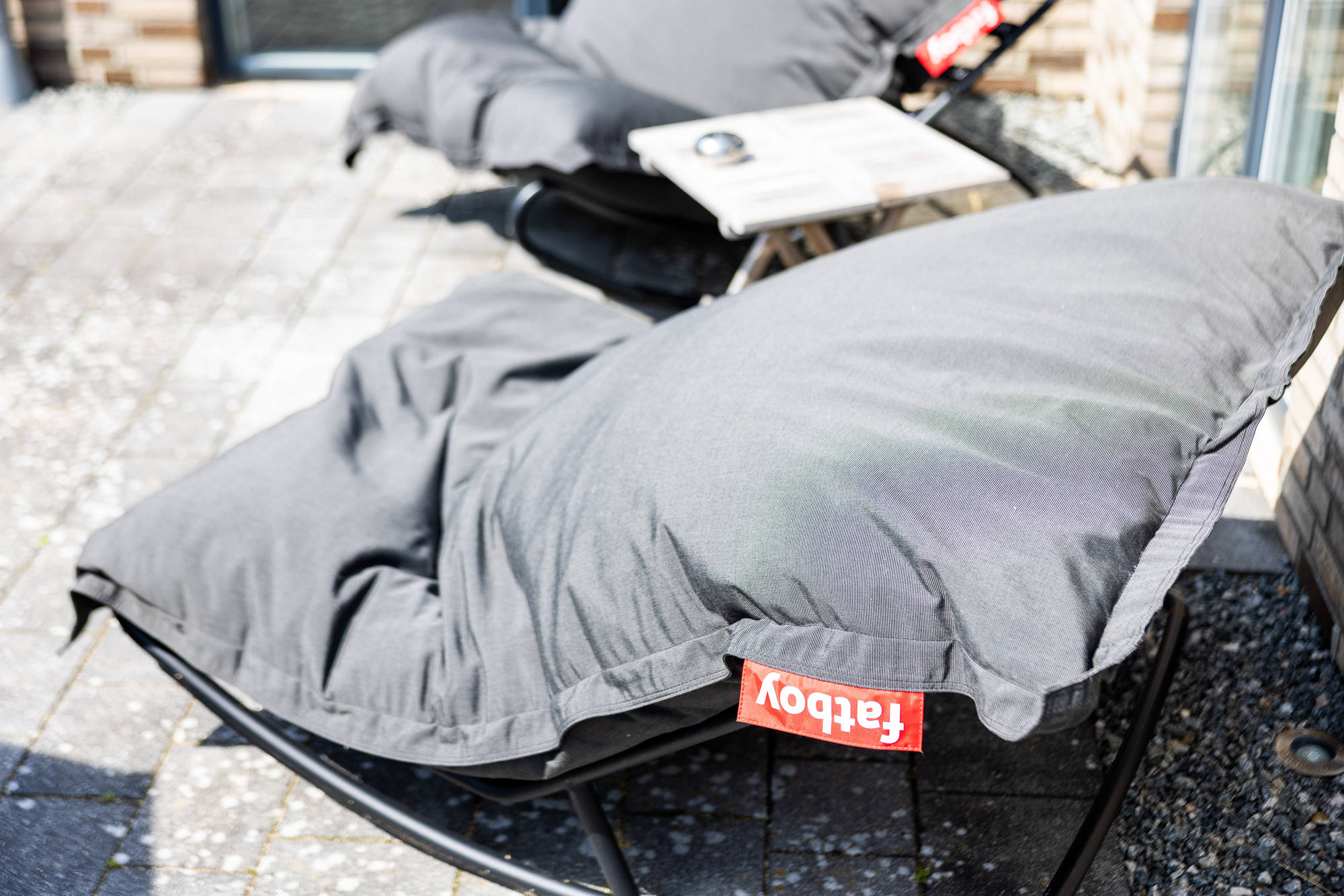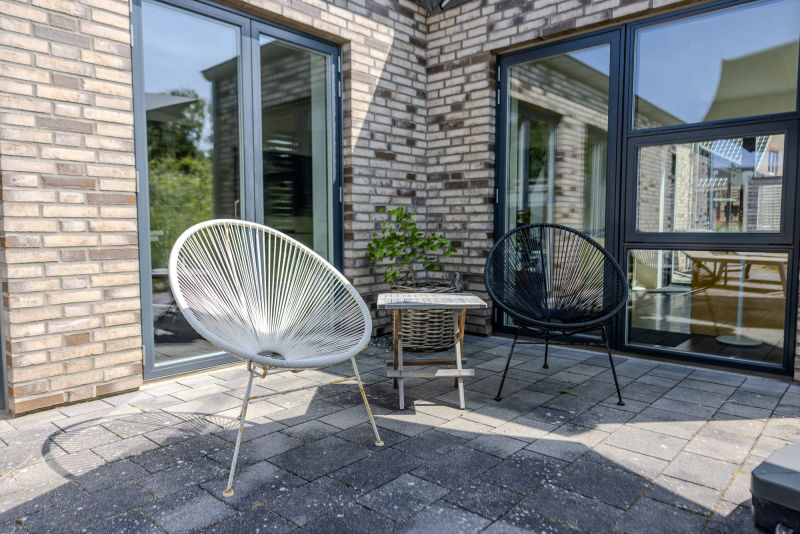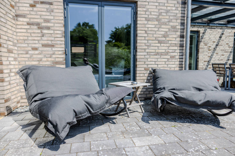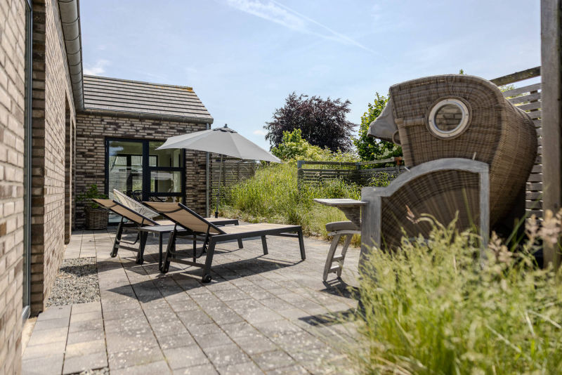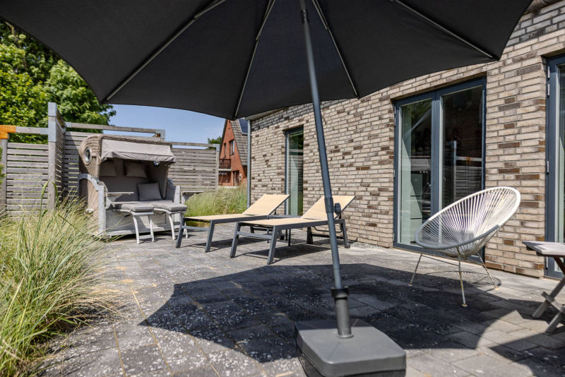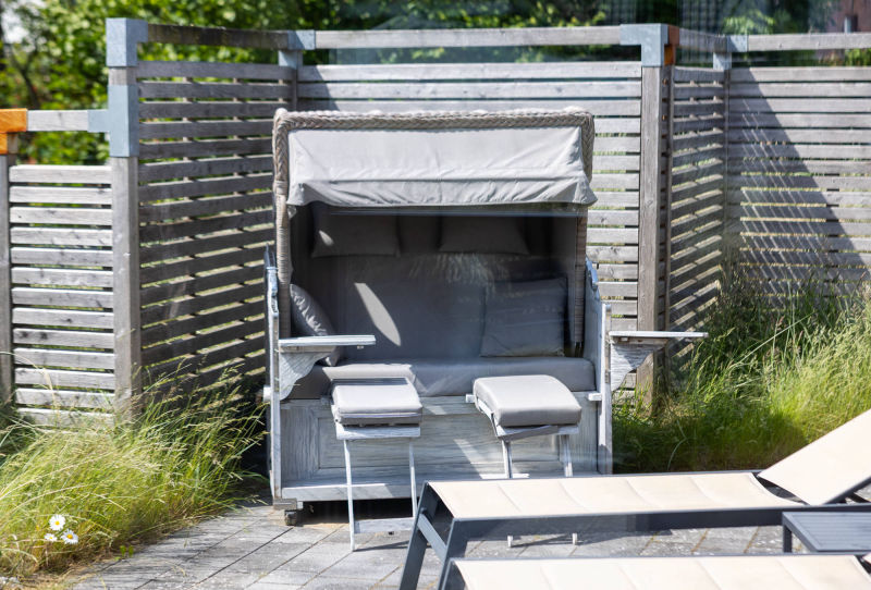 Apropos Draußen – die Terrassen sind beide perfekt ausgestattet. Eine für Sonnen-Anbeter mit Strandkorb und Beach-Club-Sitzecke. Die andere mit Lounge-Möbeln, einer Grill-Ecke und einem Glasdach, unter dem man auch genial sitzen kann, wenn der Wetter-Gott mal weniger gut gelaunt ist – ODER wir eine von diesen tropischen Nächten im Sommer haben (sollen ja mehr werden…).